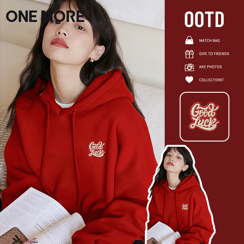 one more加绒连帽卫衣女冬季新款高级感本命年红色新年长袖上衣S