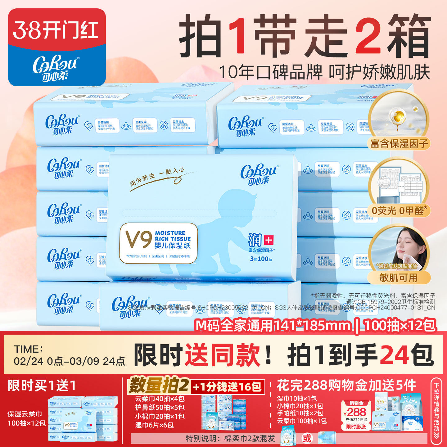【买1送1】可心柔婴儿纸宝宝专用保湿纸乳霜抽纸柔纸巾100抽12包