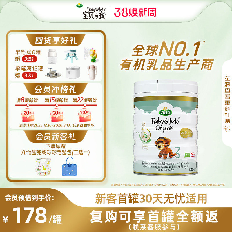 Arla宝贝与我 丹麦进口 有机A2 白金罐 婴幼儿奶粉 3段600g 1-3岁