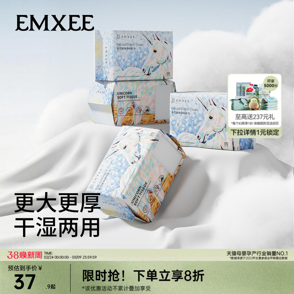嫚熙独角兽绵柔巾婴儿可用宝宝干湿两用一次性洗脸巾非纯棉棉柔巾