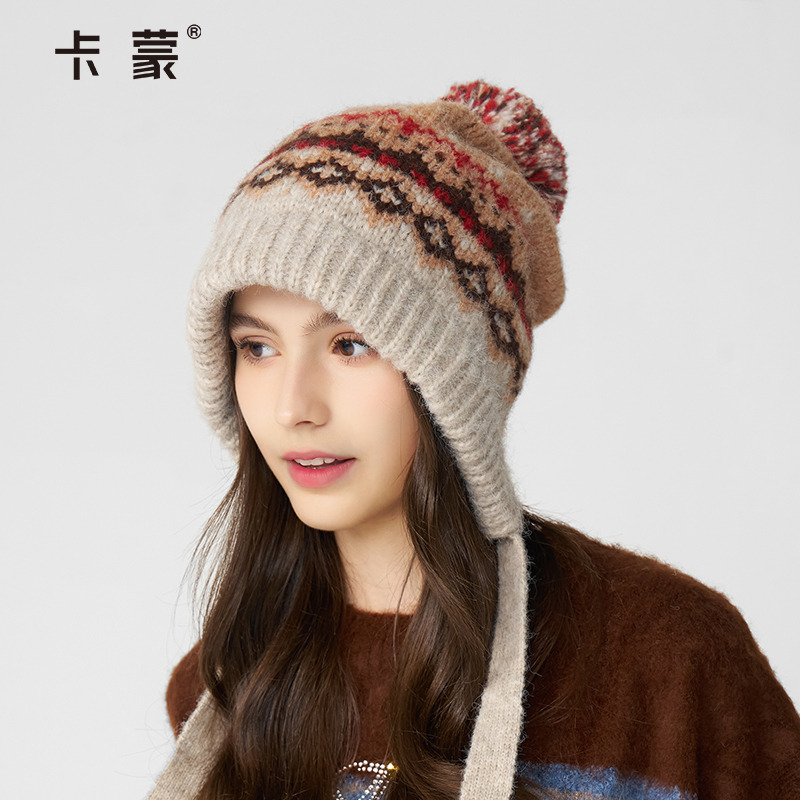 卡蒙新款帽子针织帽冬帽红色提花护耳帽东北防风防寒保暖毛线帽女