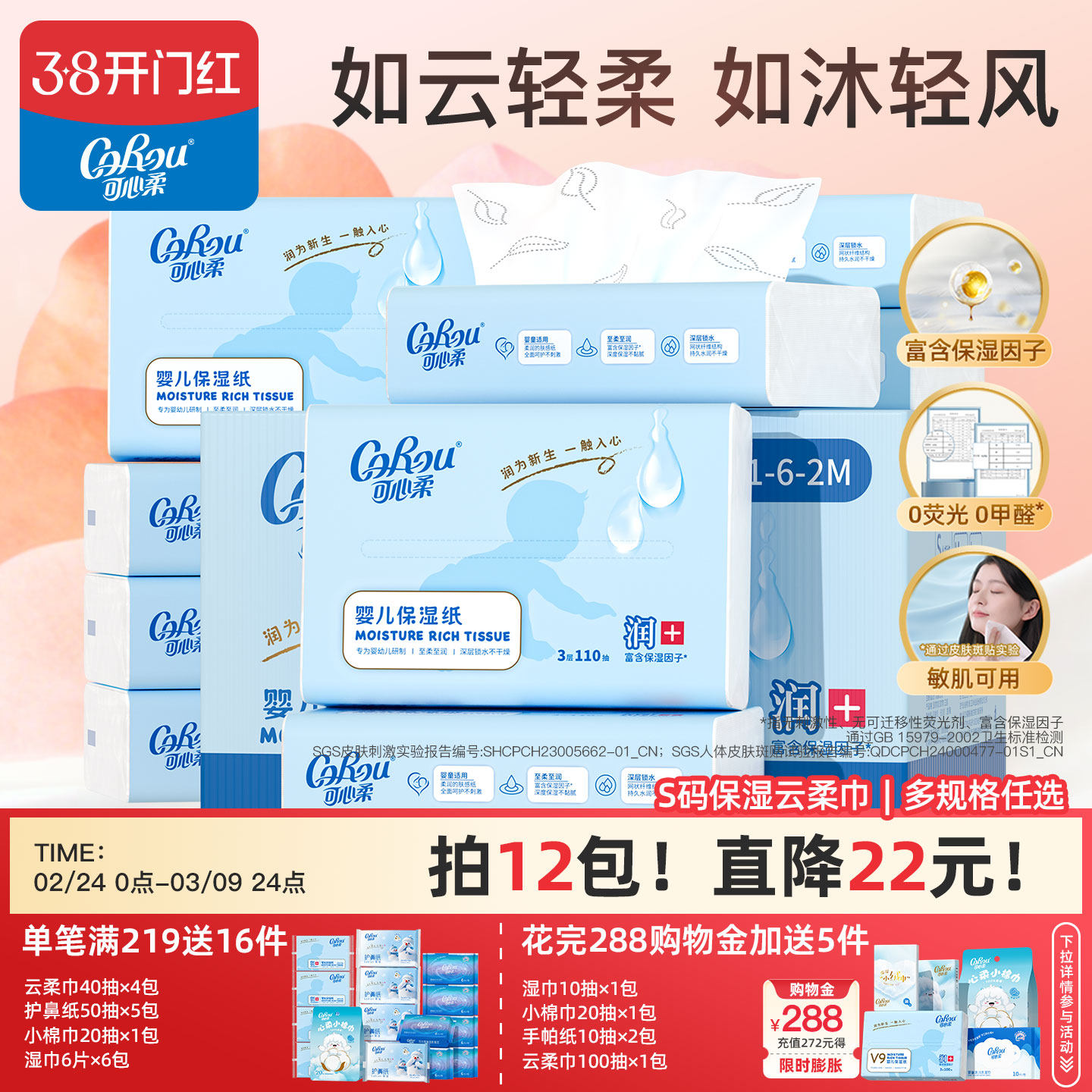 可心柔婴儿柔纸巾专用超柔宝宝云柔巾保湿抽纸乳霜纸S码110抽囤货