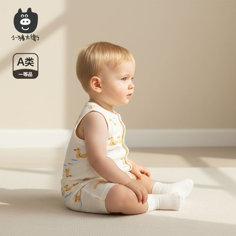 小猪大卫新生婴儿纯棉连体衣夏A类无骨对开爬服男女宝宝薄款哈衣