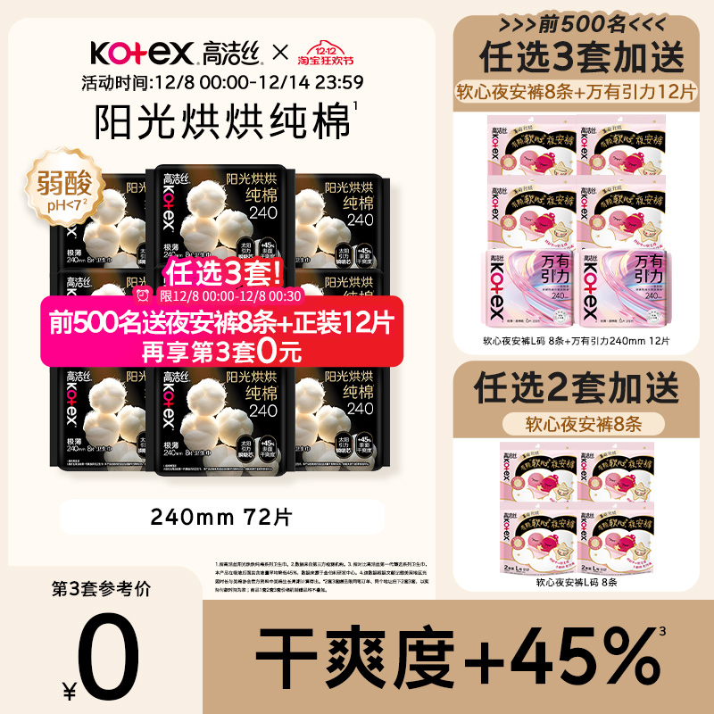 【任选3套!再加赠】高洁丝阳光烘烘纯棉卫生巾防漏日夜组合