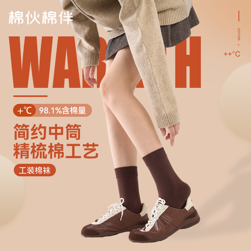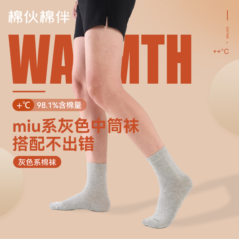 棉伙棉伴纯棉中筒袜抗起球男女纯色透气舒适耐穿日常百搭