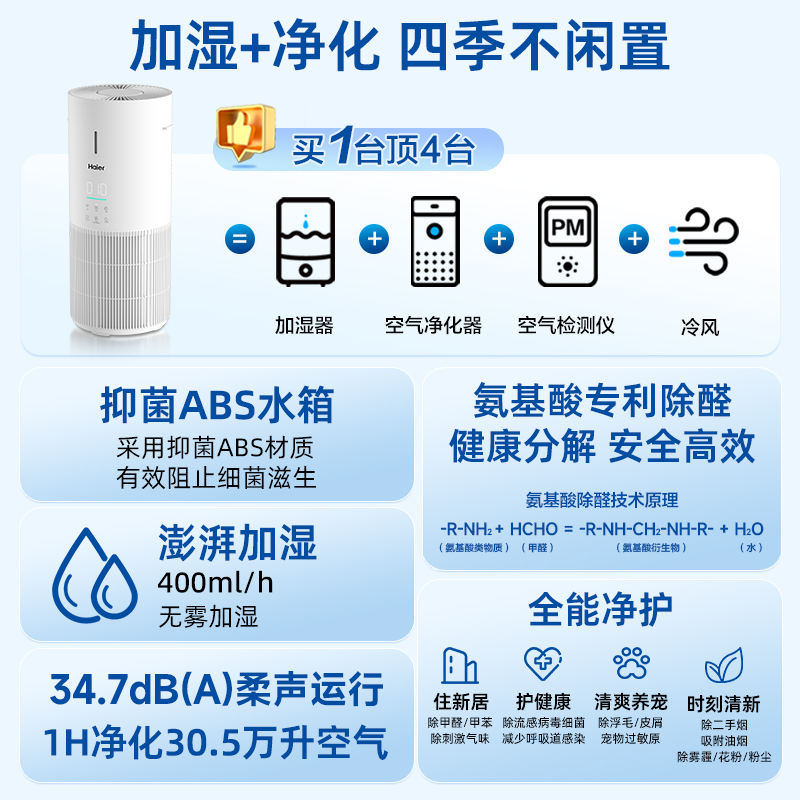 海尔麦浪空气净化加湿器一体机家用除甲醛菌灰尘去异味空气净化器