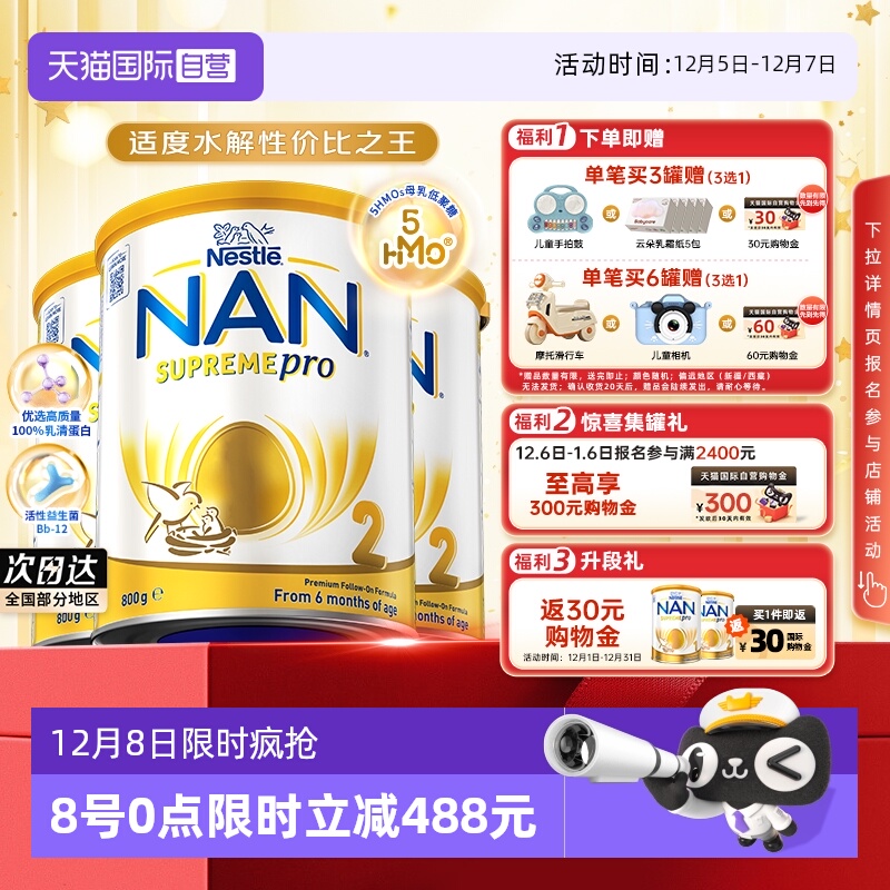 【自营】雀巢澳版超级能恩2段5HMO适度水解婴幼儿奶粉800g*3罐